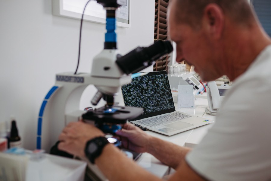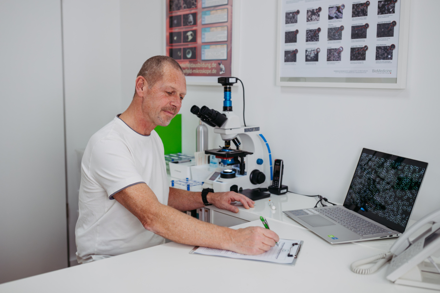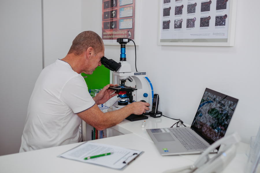 Die Blutanalyse, Bewertung und Diagnostik wird in meiner Praxis durch die Dunkelfeld-Mikroskopie durchgeführt. Diese ermöglicht im Gegensatz zur Durchlicht-(Hellfeld)- Mikroskopie eine gänzlich andere Betrachtung und Interpretation sämtlicher Blutzellen und Inhalte, sowie die Sichtbarmachung von elementaren Inhalten und Prozessen, welche in der schulmedizinischen Blutdiagnostik nicht möglich ist.